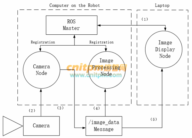 "机器人开始阶段,所有节点都要注册 (Registration) 到Master上,注册后,摄像头节点声明它要发布(Publish)一个叫做/image_data的消息。另外两个节点(图像处理处理节点和图像显示节点)声明它们需要订阅( Subscribe) 这个/image_data消息。因此, 一旦摄像头节点收到相机发送的数据(Data),就立即将数据/image_data直接发送到另外两个节点。