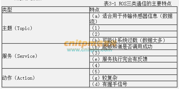 ROS为应用程序间通信提供了主题(Topic) 、服务 (Service)和动作 (Action) 三种消息通信方式,每种通信方式都有其特点。请将以下给出的三类通信的主要特点填入表3-1中(1)-(5) 的空白处,将答案写在答题纸上。