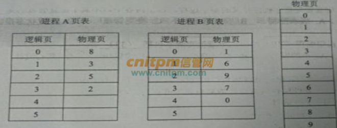 某操作系统采用分页存储管理方式,下图给出了进程A和进程B的页表结构。如果物理页的大小为1KB字节,那么进程A中逻辑地址为1024(十进制)用变量存放在()号物理内存页中。假设进程A的逻辑页4与进程B的逻辑页5要共享物理页4,那么应该在进程A页表的逻辑页4和进程B页表的逻辑页5对应的物理页处分别填()。