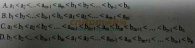 两个递增序列 A 和 B 的长度分别为 m 和 n(m< m且m 与 n 接近), 将二者归并为一个长度为 m+n 的递增序列。 当元素关系为( ) , 归并过程中元素的比较次数最少。