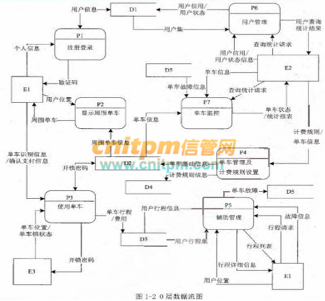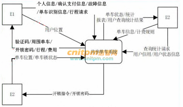 现采用结构化方法对共享单车系统进行分析与设计,获得如图1-1所示的上下文数据流图和图1-2所示的0层数据流图。