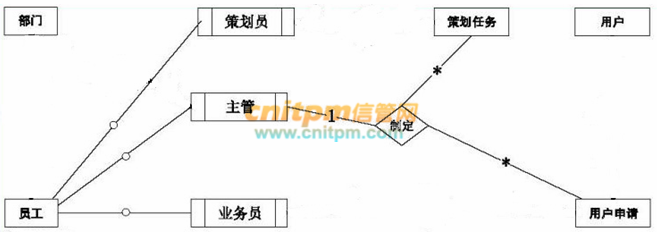 (5)策划部主管为已受理的用户申请制定会议策划任务。策划任务包括申请号,任务明细和要求完成时间。申请号唯一标识策划任务的每一个元组。一个策划任务只对应一个已受理的用户申请,但一个策划任务可由多名策划员参与执行,且一名策划员可以参与执行多项策划任务。