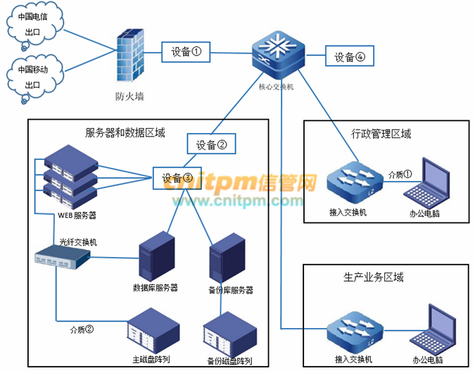某企业网络拓扑如图1-1所示,中国电信和中国移动双链路接入,采用硬件设备实现链路负载均衡,主磁盘阵列的数据通过备份服务器到备份磁盘阵列。请结合下图,回答相关问题。