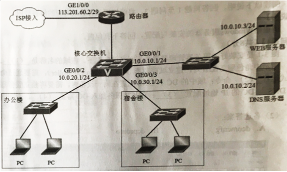 图4-1为某学校网络拓扑图,运营商分配的公网IP地址为113.201.60.1/29,运营商网关地址为113.201.60.1,内部用户通过路由器代理上网,代理地址为113.201.60.2。核心交换机配置基于全局的DHCP服务,为办公楼和宿舍楼用户提供DHCP服务。内部网络划分为3个VLAN,其中VLAN10的地址10.0.10.1/24,VLAN20的地址10.0.20.1/24,VLAN30的地址10.0.30.1/24,请结合下图,回答相关问题。