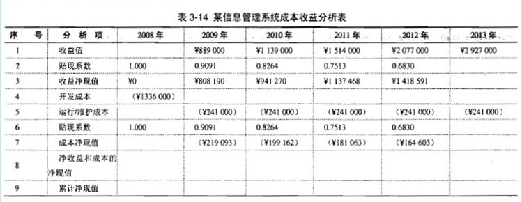 某软件公司准备开发一套建筑施工项目管理软件,该软件应具有项目管理计划的编制及项目的动态管理功能,其生存周期为5年。该系统的预计开发成本、预计的年运行/维护成本,以及预计的收益如表3-14所示(其中带括号的数据表示负值).