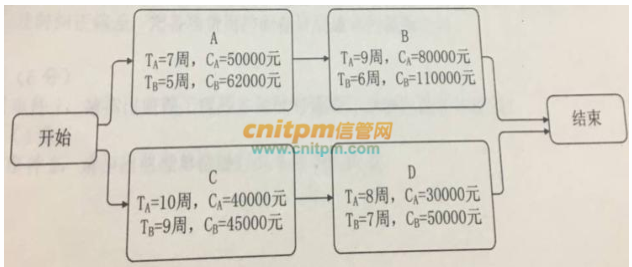 某监理单位承担了一个信息系统工程全过程的监理工作,在应用系统建设过程中,由于工期紧张,成本有限,监理工程师按照承建单位的进度计划严格进行跟踪检查,并要求承建单位对 A、B、C、D 四个重要活动进行成本优化。监理工程师在检查承建单位项目经理的成本优化方案时,检查了如下网络图:(其中 TA 表示正常工期,TB 表示应急工期,CA 表示正常成本,CB 表示应急成本)。(15分)