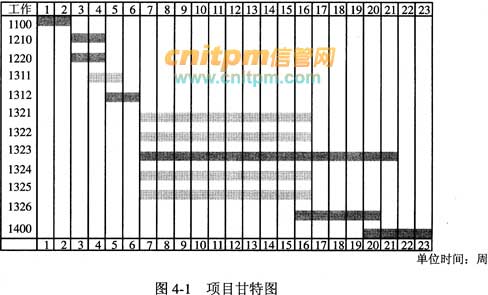 假设该项目计划的甘特图如图4-1所示,请绘制该项目的费用预算曲线图(时间单位为周,每周按照5个工作日计算)