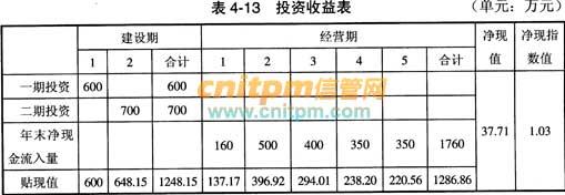 项目开发B方案的技术经济描述:B方案分两期建设,两个合同。一期包含3个子系统,开发周期为1年,第一年初投资为600万元,项目建成后即投入运行,第一运行年度末产生的净现金流入量为160万元。第二期项目投资于第一期项目建成后启动,包含3个子系统,开发周期为1年,投资700万元。第二期项目的建设必须有第一期项目的支持,建成后与第一期项目一起运行,每年年末的净现金流入量见表4-13。方案B投资收益如表4-13所示。