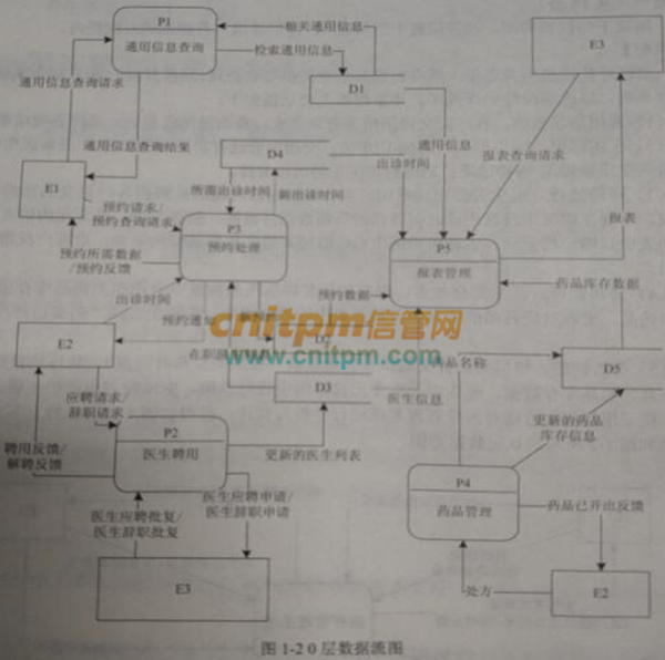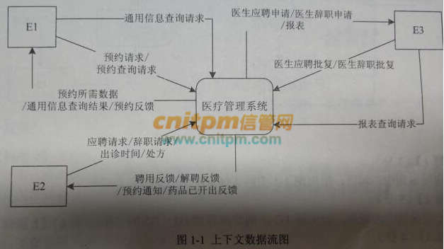现采用结构化方法对医疗管理系统进行分析与设计,获得如图1-1所示的上下文数据流图和图1-2所示的0层数据流图。