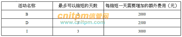 在项目开始前,客户希望将项目工期压缩为19天,并愿意承担所发生的所有额外费用。经过对各项活动的测算发现,只有活动B、D、I有可能缩短工期,其余活动均无法缩短工期。活动B、D、I最多可以缩短的天数以及额外费用如下: