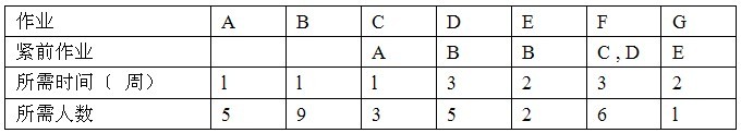 某工程包括A、B、C、D、E、F、G 七个作业,各个作业的紧前作业、所需时间、所需人数如下表: