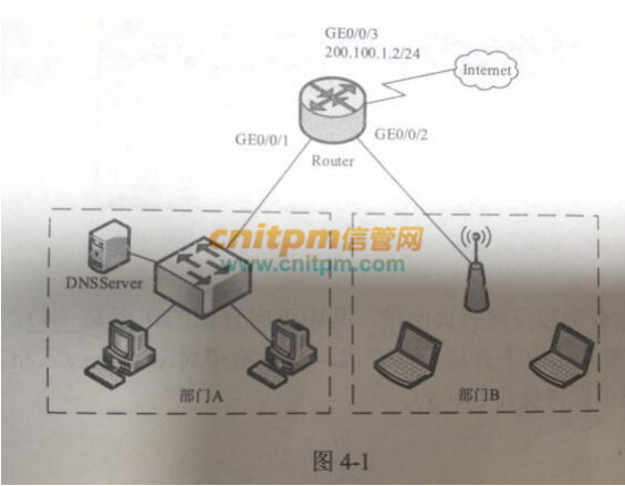 某企业的网络结构如图4-1所示。Router作为企业出口网关。该企业有两个部门A和B,为部门A和B分配的网段地址是:10.10.1.0/25和10.10.1.128/25。