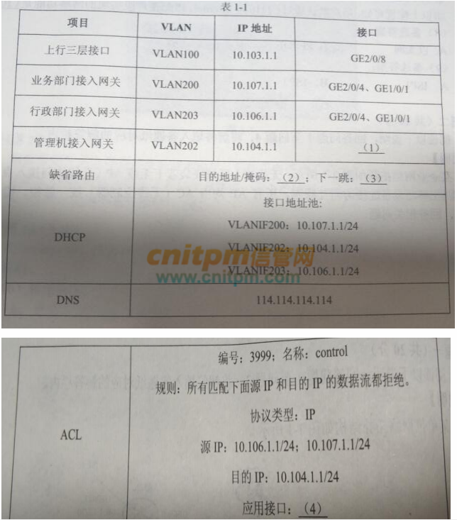 2.根据表1-1中的ACL策略,业务部门不能访问(5)网段。