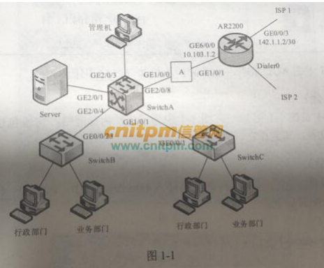 1.结合网络拓扑图1-1,将SwitchA业务数据规划表中的内容补充完整。