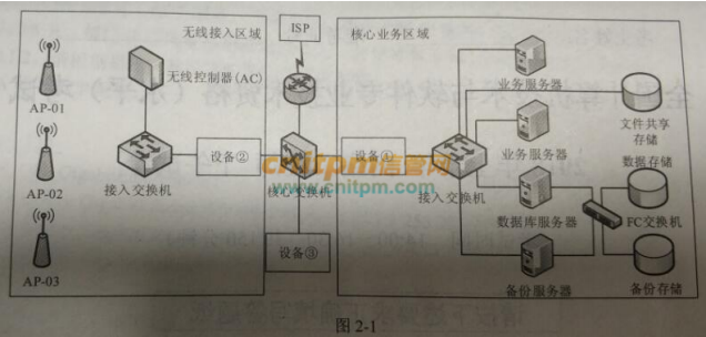 1.常见存储连接方式包括直连式存储(DAS)、网络接入存储(NAS)、存储区域网络(SAN)等。图2-1中,文件共享存储的连接方式为(14),备份存储的连接方式为(15)。