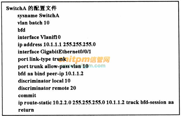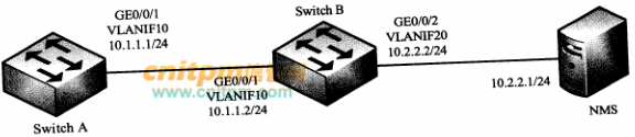 57题: 如图所示,Switch A通过Switch B和NMS跨网段相连并正常通信。SwitchA 与Switch B配置相似,从给出的Switch A的配置文件可知该配置实现的是( 1 ),验证配置结果的命令是( 2 )。