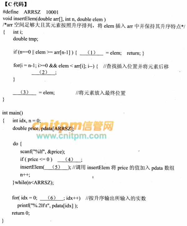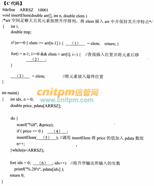 【说明】函数insertElem 的功能是在元素升序排列的数组中加入一个新元素并保持数组元素升序排列的特点。在main函数中输入若干表示价格的实数,输入为0或负数或实数个数超出限定数量时终止,调用insertElem将价格按升序保存在数组pdata中,最后输出所输入的实数。