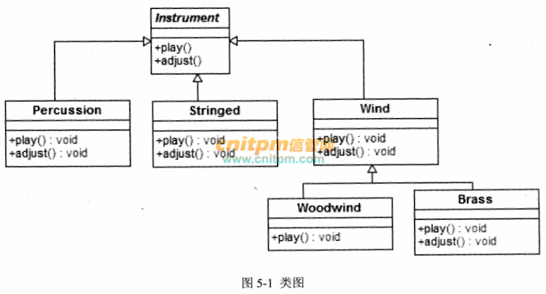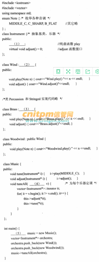 【说明】以下Java代码实现一个简单乐器系统,音乐类(Music)可以使用各类乐器(Instrument)进行演奏和调音等操作。对部分乐器进行建模,其类图如图5-1所示,包括:乐器Instrument)、打击乐器(Percussion)、弦乐器(Stringed)、管乐器(Wind)、木管乐器(Woodwind)、铜管乐器(Brass)。【Java代码】问题:5.1 阅读以下说明和Java程序,填写程序中的空(1) ~(5),将解答写入答题纸的对应栏内。