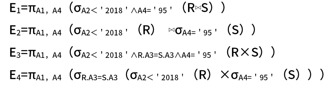 在关系 R(A1,A2,A3)和 S(A2,A3,A4)上进行关系运算的 4 个等价的表达式 E1、E2、E3和 E4 如下所示:如果严格按照表达式运算顺序执行,则查询效率最高的是表达式( )。A.E1 B.E2 C.E3 D.E4