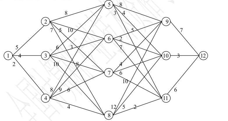 制造某种产品需要四道工序,每道工序可选用多种方法。下图列出了制造这种产品各道工序可选用的不同方法:从节点1开始,连续经过4条线段(表示4道工序所 选用的方法),组成一条线路,直到节点12结束。每条线段上标记的数字表示利用相应方法每件产品可以获得的利润(元)。企业为了获取最大利润,需要找出从 节点1到节点12的一条线路,使其对应的各道工序的利润之和达到最大。利用运筹方法计算后可知,制造每件产品可以获得的最大利润是( )元。