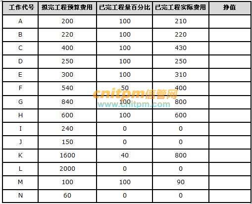 问题: (1) 计算每项工作的BCWP及第10周末的BCWS、ACWP、BCWP合计? (2) 计算第10周末的CV、SV、CPI、SPI并分析成本和进度的控制状况?