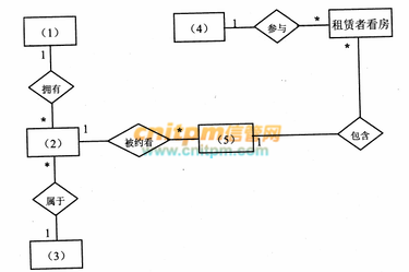 若采用信息工程(Information Engineering)方法对房屋租赁服务系统进行分析,得到如图 2-2 所示的 ERD。请给出图 2-2 中实体(1)~ (5)的名称。