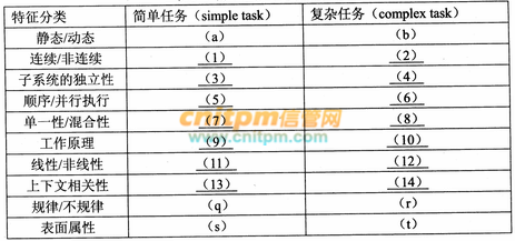 王工提交的设计方案中指出:由于公司目前研制的嵌入式实时产品属于简单型系统,其嵌入式子系统相互独立,功能单一,时序简单。而未来满足网络化、智能化和综合化的嵌入式实时系统将是一种复杂系统,其核心特征体现为实时任务的机理、状态和行为的复杂性。简单任务和复杂任务的特征区分主要表现在十个方面。请参考表 3-1 给出的实时任务特征分类,用题干中给出的(a)~(t)20 个实时任务特征描述,补充完善表 3-1 给出的空(1)~(14)。