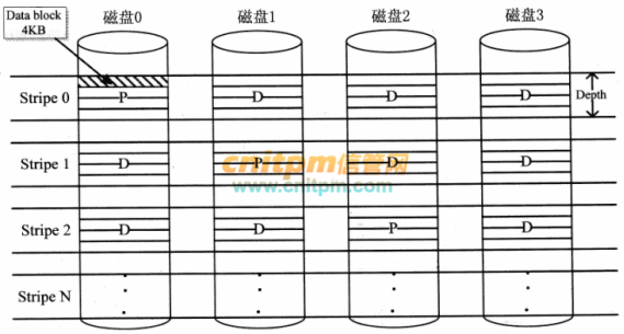 图2-1为某台服务器的RAID ( Redundant Array of Independent Disk,独立冗余磁盘阵列)示意图,一般进行RAID配置时会根据业务需求设置相应的RAID条带深度和大小,本服务器由4块磁盘组成,其中P表示校验段、D表示数据段,每个数据块为4KB,每个条带在一个磁盘上的数据段包括4个数据块。