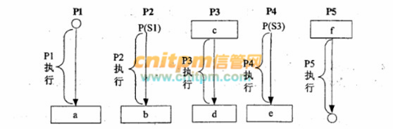 若用PV操作控制进程P1、P2、P3、P4和P5并发执行的过程,则需要设置5个信号量S1.S2.S3.S4和S5,且信号量S1~S5的初值都等于零。下图中a和b处应分别填写(25);c和d处应分别填写(26),e和f处应分别填写(27)。