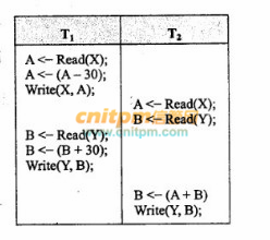 如右图所示的并发调度,假设事务T1、T2执行前数据项X、Y的初值为X=100,Y=200。该调度执行完成后,X、Y的值为(54);此类不一致性称为(55)。(54)A.X=70,Y=300 B.X=70,Y=330 C.X=70,Y=270 D.X=70,Y=230(55)A.丢失修改 B.读脏数据 C.不可重复读 D.破坏事务原子性