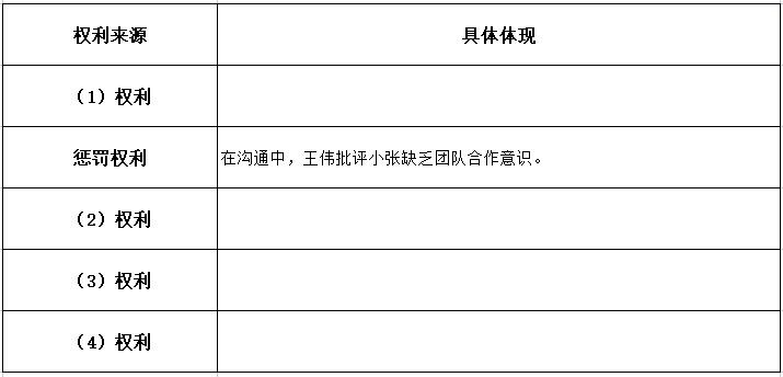 管理者的权力来源有5种,请指出这5种权力在王伟身上的具体体现(请将(1)~(4)处的答案及具体表现填写在答题纸的对应表格内)。