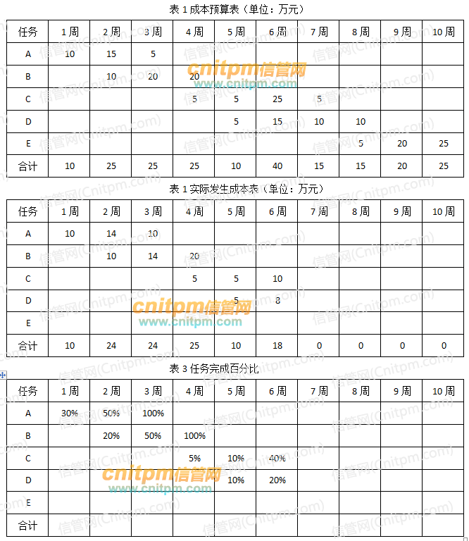 某公司完成一个工期10周的系统集成项目,该项目包含ABCDE五项任务。项目经理制定了成本预算表(如表1),执行过程中记录了每个时段项目的执行情况(如表2、表3)。