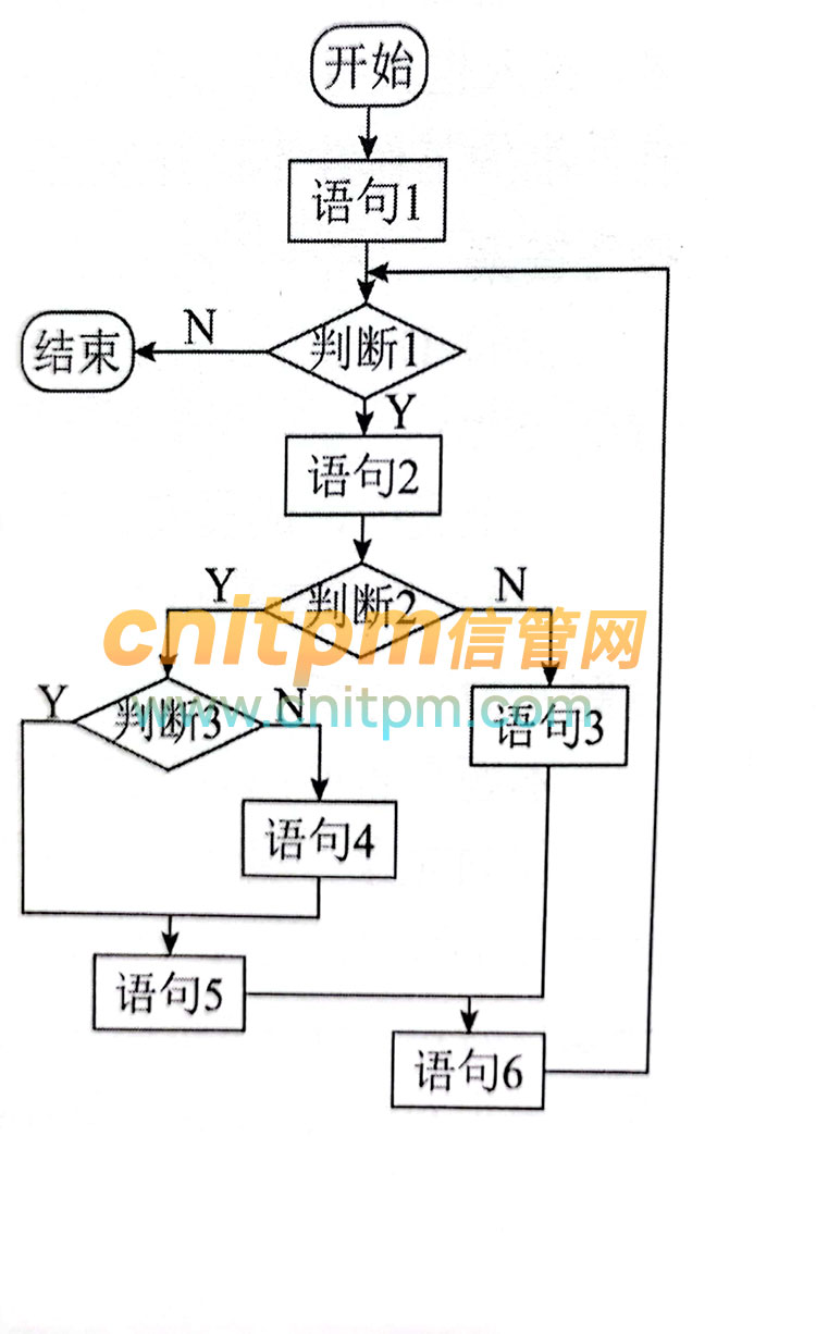 下图用白盒测试方法进行测试,图中有( )条路径采用McCabe度量计算该程序图的环路复杂性为( )(1)A、3B、4C、5D、6(2)A、3B、4C、5D、6