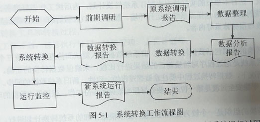 某系统转换包括前期调研、数据整理、数据转换、系统转换、运行监控五个阶段。系统转换的整个工作流程如图5-1所示: