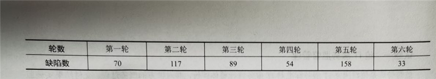 编程结束后,进入了测试阶段。第一轮测试,发现了70个缺陷,项目组对发现的缺陷进行了修复,又重新提交了测试。第二轮又发现了100多个缺陷,就这样反复修改和测试,直到第六轮,发现了33个缺陷。各轮发现的缺陷数如下: