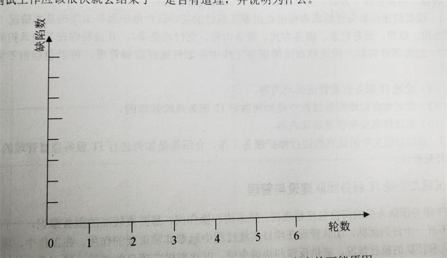 [问题2](7分)请在答题纸上标出纵坐标的刻度值,并画出测试缺陷的趋势图。根据趋势图分析“小赵觉得测试工作应该很快就会结束了”是否有道理,并说明为什么。