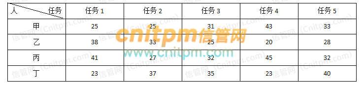 分配甲、乙、丙、丁四个人去完成五项任务。每人完成各项任务时间如表所示。由于任务多于人数,故规定其中有一个人可兼完成两项任务,其余三人每人完成一项。为了花费时间最少,()应该完成两项任务。