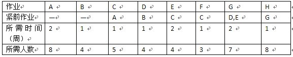 某工程包括A、B、C、D、E、F、G、H八个作业,各个作业的紧前作业、所需时间和所需人数如下表所示(假设每个人均能承担各个作业):该工程的工期应为(1)周。按此工期,整个工程至少需要(2 )人。(1)A. 8B. 9C. 10D. 11(2)A. 8B. 9C. 10D. 11