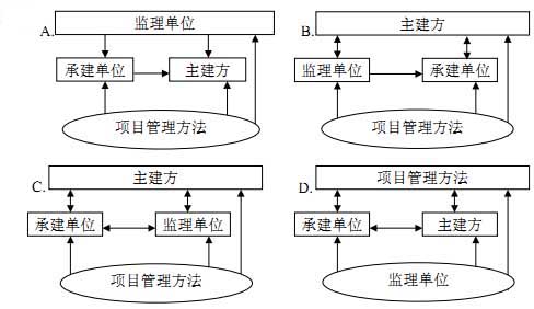 信息系统项目的实施涉及到主建方、承建单位、监理单位三方,而在三方都需要采用项目管理的方法以完成其在项目实施中所肩负的责任。下图( ) 正确表达了这种“三方一法”的关系。