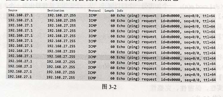 Smurf拒绝服务攻击结合IP欺骗和ICMP回复方法使大量网络数据包充斥目标系统, 引起目标系统拒绝为正常请求提供服务。请根据图3-2回答下列问题。