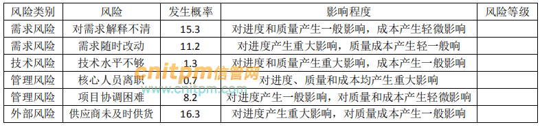 项目组从业务需求、技术、人员等方面对项目风险源进行了分析,并结合过去投行的同类项目积累的经验及专家建议将风险分为需求风险、技术风险、管理风险、外部风险四类。为界定不同层次的风险概率和影响,制定了如下表1表3: