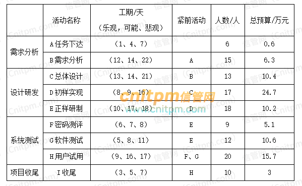 已知某公司承担一个旅游信息监管系统的开发,整个项目划分为四个阶段九项活动,项目相关信息如表所示: