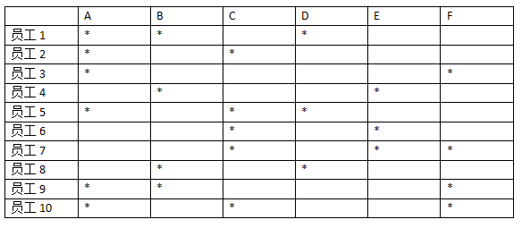 68题: 有10名员工要参加6门技术考试,下表 * 代表每个员工应该参加考试的课程。