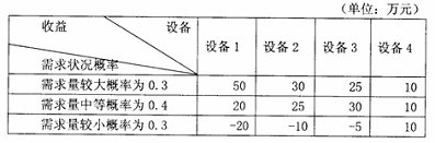 某厂需要购买生产设备生产某种产品,可以选择购买四种生产能力不同的设备,市场对该产品的需求状况有三种(需求量较大、需求量中等、需求量较小)。厂方估计四种设备在各种需求状况下的收益由下表给出,根据收益期望值最大的原则,应该购买( )。