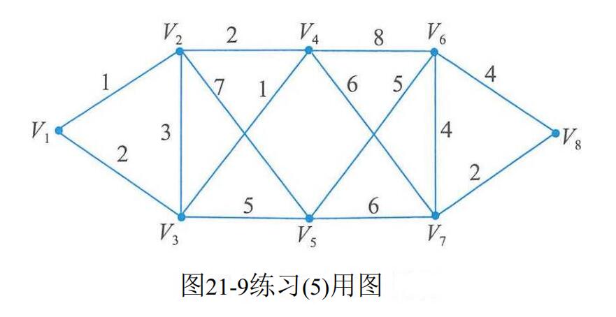 图21-9是某城市八个小区的通信线路图,图中标注的数字代表通信线路的长度(单位为km),那么现在至少要架设( )km的线路,才能保持八个小区的通信联通。A.19B.20 C.21D.22