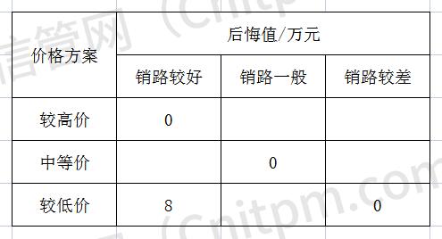 企业一旦选择了某种决策方案,在同样的销路状态下,可能会产生后悔值(即所选决策方案产生的收益与最佳决策收益值的差值)。例如,如果选择较低价决策,在销路较好时,后悔值就为8万元。因此,可以根据上述收益值表制作后悔值表如下(空缺部分自行计算)。