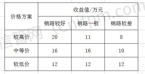 某企业开发了一种新产品,拟定的价格方案有三种:较高价、中等价和较低价。估计这种产品的销售状态也有三种:销路较好、销路一般和销路较差。根据以往的销售经验,他们算出,这三种价格方案在三种销路状态下的收益值如表所示。