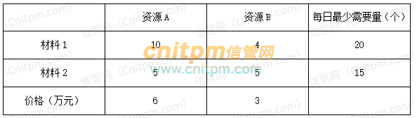 67题: 一个项目需要A和B两种资源,每种资源包含材料1、材料2。对于项目来说,这两种材料每日需要量如表所示。请问项目每日使用资源A的量为(),使用资源B的量为(),可使得在满足要求的情况下总费用最少。