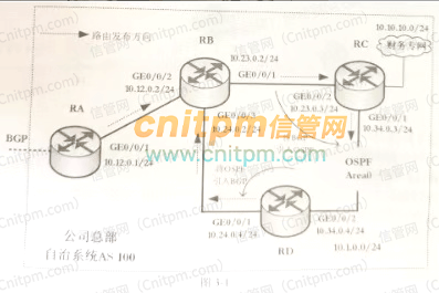 图3-1为某公司网络骨干路由拓扑片段(分部网络略),公司总部与分部之间运行BGP获得路由,路由器RA、RB、RC以及RD之间配置iBGP建立邻居关系,RC和RD之间配置OSPF进程。所有路由器接口地址信息如图所示,假设各路由器已经完成各个接口IP等基本信息配置。