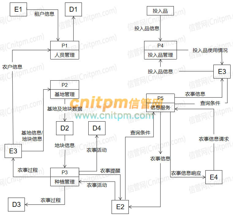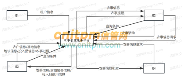 现采用结构化方法对农事管理服务平台进行分析与设计,获得如图所示的上下文数据流图和图2所示的0层数据流图